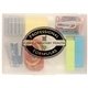 - Use this divided translucent box with lid to keep your desk neat and tidy. It includes everything you need for your workspace, including a stapler, staples, paper clips, rubber bands, transparent tape, adhesive notes, and flags. Whether working from home or the office, you’ll want this small office supply kit nearby.